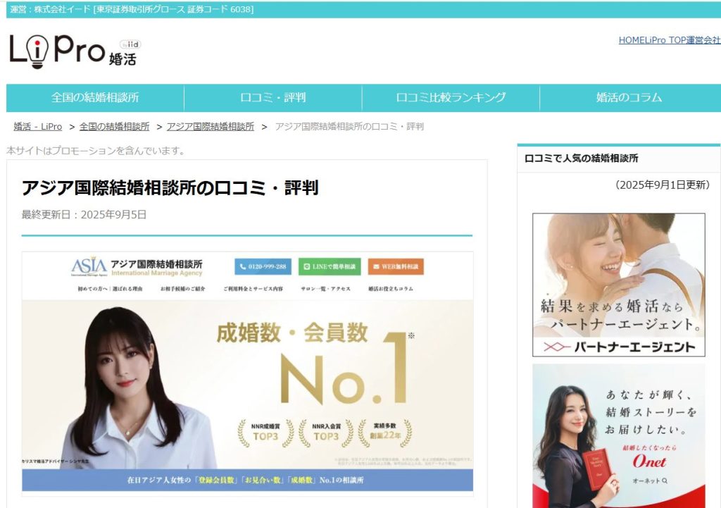 このたび、婚活情報メディア「LiPro婚活」に、アジア国際結婚相談所 が紹介されました。